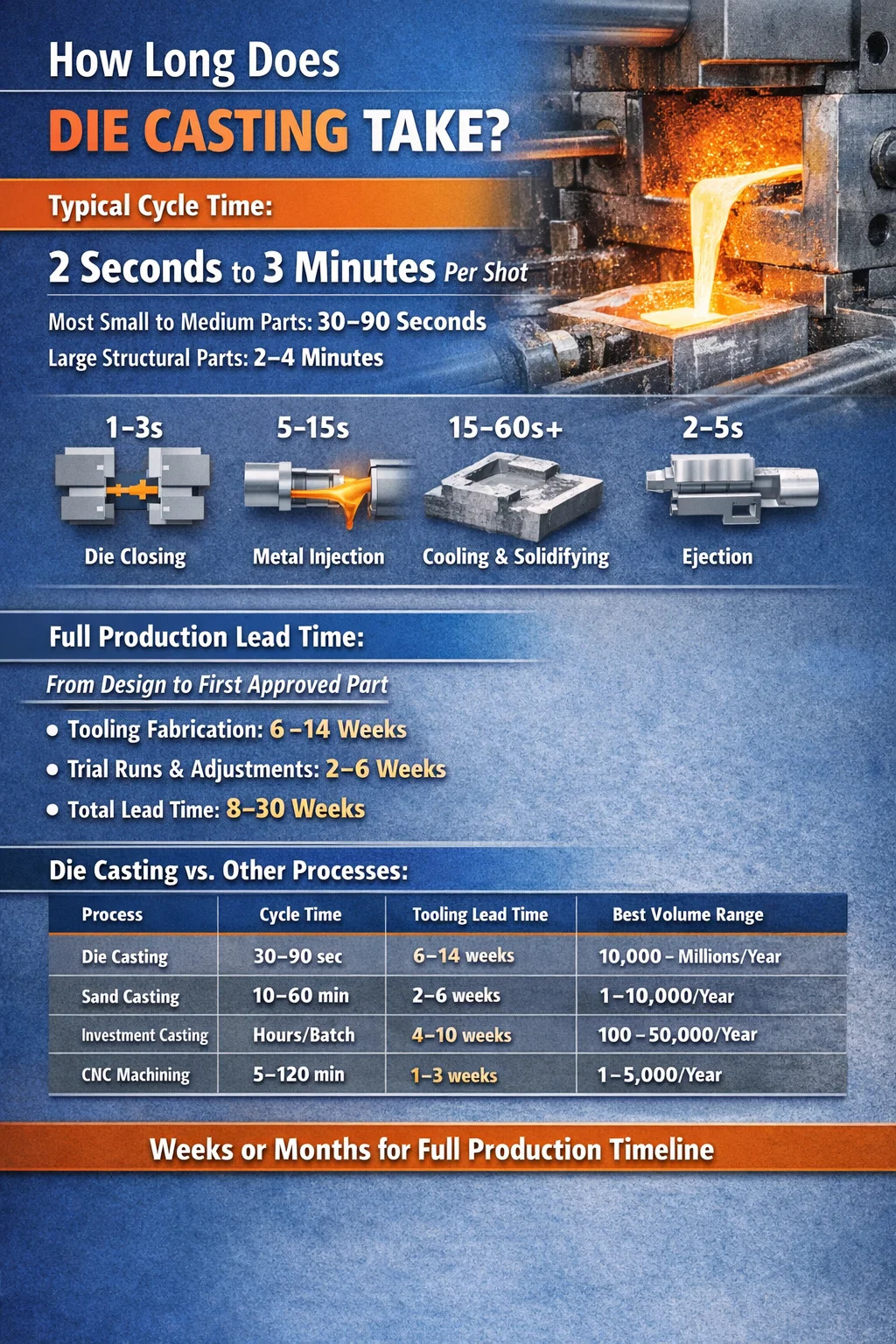 Ta brojka vremena ciklusa govori samo dio priče. Prije nego što prvi dobar dio siđe s trake, operacija tlačnog lijevanja uključuje izradu alata (koja može potrajati 6-14 tjedana), postavljanje stroja, predgrijavanje kalupa, probne snimke i validaciju dimenzija. Od sirovog dizajna do odobrenog proizvodnog dijela, puni rok se mjeri u tjednima ili mjesecima, a ne u sekundama.
