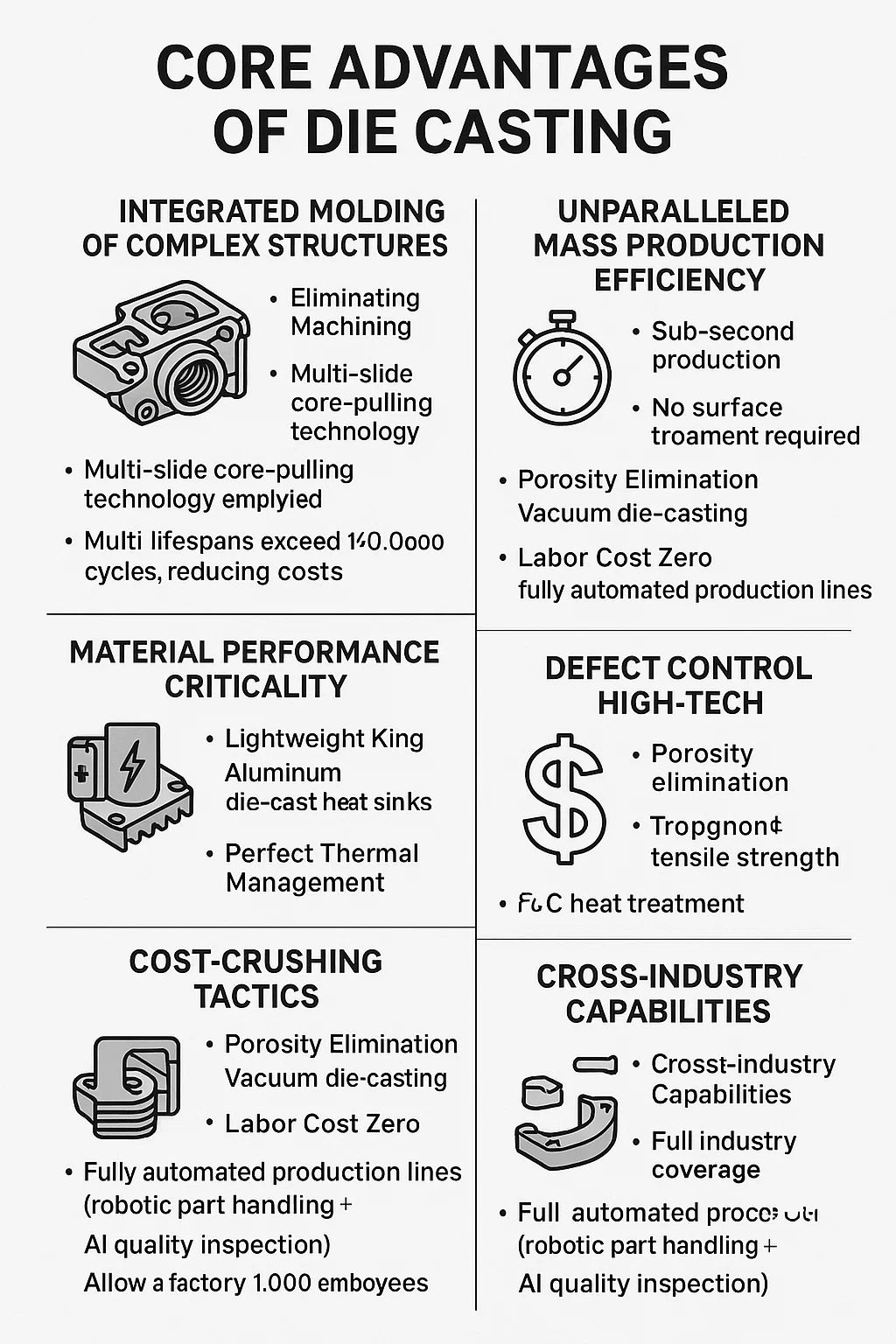 Jednodijelna vremena ciklusa oblikovanja od 10-60 sekundi (do 30 dijelova u minuti za dijelove legure cinka), s 24/7 proizvodnim kapacitetom od 10 000 dijelova.