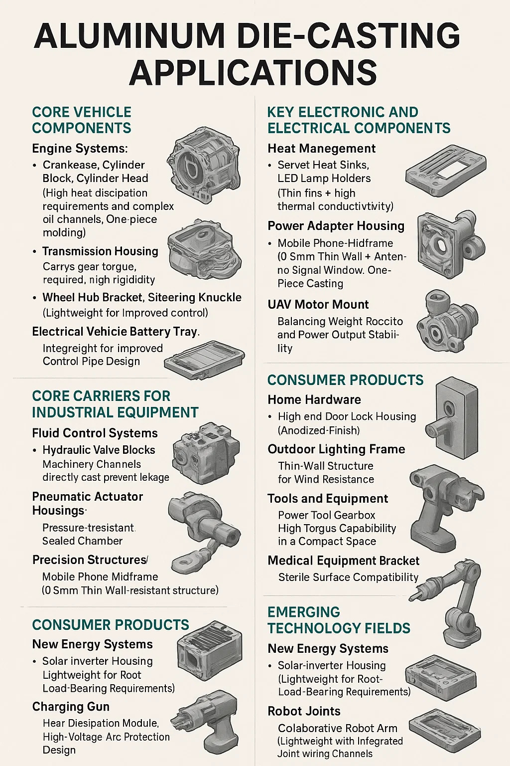 | Elektronika | • Okviri pametnog telefona/prijenosnog računala • 5G toplinski sudoper • Moćni motorni motocidi • mjenjači alata za napajanje | ▪️ tanki zidovi (0,5–1 mm) za kompaktnost na EMI/RF zaštitu mogućnost zaštite na sloboda Dizajn raspršivanja topline sloboda |