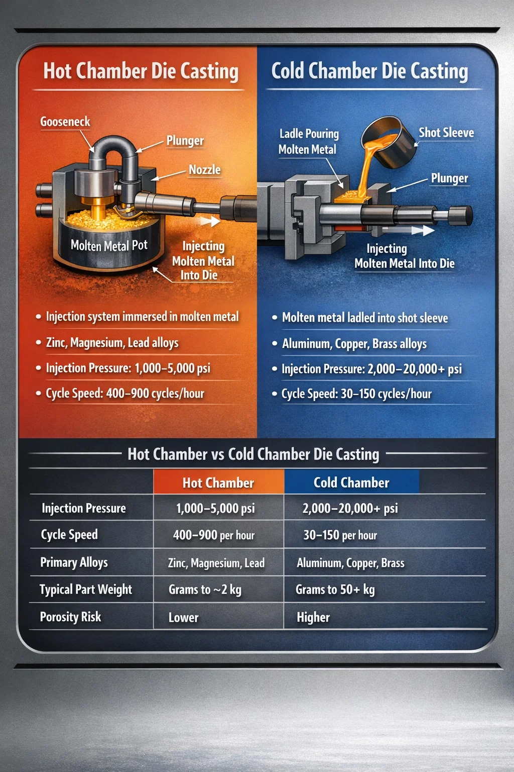 Dvije osnovne metode tlačnog lijevanja su tlačni lijev u vrućoj komori i tlačni lijev u hladnoj komori . Ova dva procesa dijele isti temeljni cilj - tjeranje rastaljenog metala u kalup od kaljenog čelika pod visokim pritiskom kako bi se proizveli precizni, ponovljivi dijelovi - ali se značajno razlikuju u načinu na koji se metal topi, kako se njime rukuje i kako se ubrizgava. Odabir pogrešne metode za vašu leguru ili geometriju dijela može rezultirati lošim punjenjem, prekomjernom poroznošću, preranim trošenjem kalupa i skupim stopama otpada. Razumijevanje onoga što razdvaja ove dvije metode početna je točka za svaku ozbiljnu odluku o lijevanju pod pritiskom.