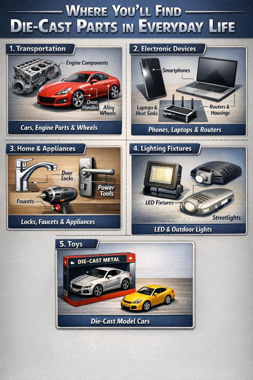 Lijevanje pod pritiskom prvenstveno se koristi za proizvodnju predmeta koji zahtijevaju trajnost, precizne oblike i masovnu proizvodnju. Evo nekih od najčešćih upotreba u svakodnevnom životu: