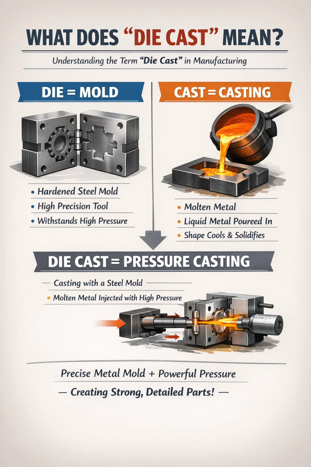 Kombinirajući ove dvije riječi u "lijevano pod pritiskom", osnovno značenje je: lijevanje pod pritiskom pomoću preciznog metalnog kalupa.